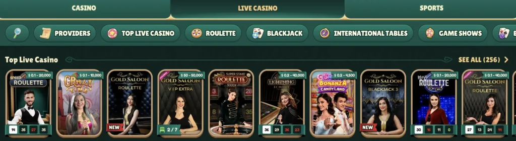 - Click on the Live Casino tab on the homepage to see all table and card picks with streaming functionalities.